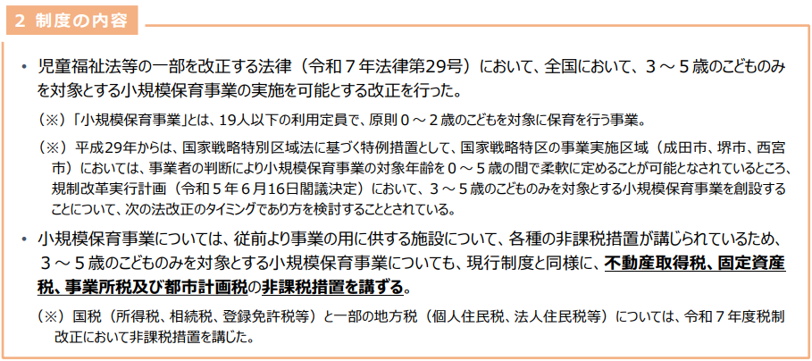 児童福祉法の改正後の小規模保育事業について、現行制度と同様に、社会福祉法人等が当該事業の用に供する固定資産に係る固定資産税及び都市計画税等を非課税とする措置を講ずる。