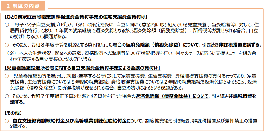 ひとり親家庭高等職業訓練促進資金貸付事業の住宅支援資金貸付け及び児童養護施設退所者等に対する自立支援資金貸付事業による金銭の貸付けにつき、当該貸付けに係る債務の免除を受ける場合には、当該免除により受ける経済的な利益の価額については、引き続き所得税等を非課税とする。